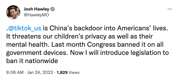 Senator Hawley’s No TikTok on Government Devices Act was signed into law last year.
