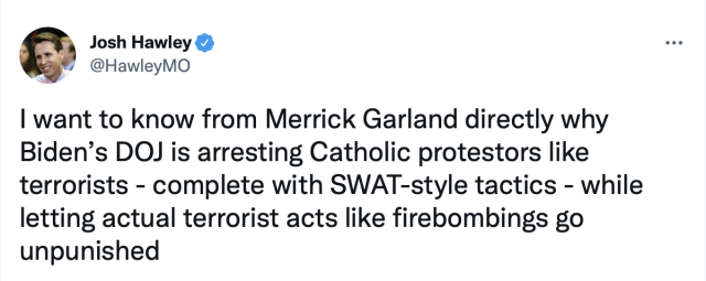 Today U.S. Senator Josh Hawley (R-Mo.) sent a letter to Attorney General Merrick Garland demanding answers on reports the Federal Bureau of Investigation (FBI) sent as many as 25 armed agents to arrest a pro-life activist following a local dispute outside of an abortion clinic. Senator Hawley also called on Garland to answer for repeatedly weaponizing the FBI and other arms of the federal government against political opponents.