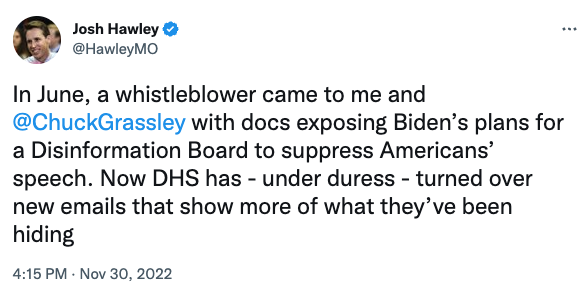 In June, whistleblower documents obtained by Senators Hawley and Chuck Grassley (R-Iowa) revealed a first-look at DHS’s internal plans for the Disinformation Governance Board, including a potential partnership with Twitter and a public-facing “Rumor Control Program.”