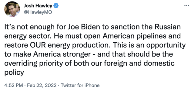 U.S. Senator Josh Hawley (R-Mo.) responded to the Biden Administration’s announcement of sanctions on the Russian energy sector.