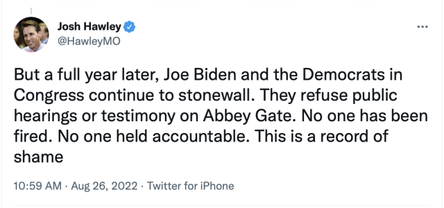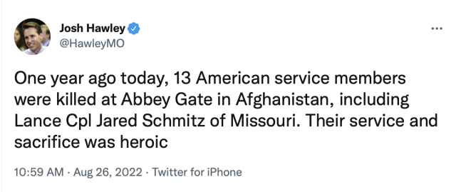Today U.S. Senator Josh Hawley (R-Mo.) commented on the terrorist attack one year ago at Hamid Karzai International Airport’s Abbey Gate in Kabul, which claimed the lives of 13 American service members: