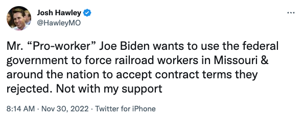 Today U.S. Senator Josh Hawley (R-Mo.) released the following statement on the potential rail strike after the Biden Administration announced it supports government intervention on behalf of large corporations by overruling the requests of union workers. A rail strike could begin as early as Dec. 9, 2022, if a new agreement is not struck.