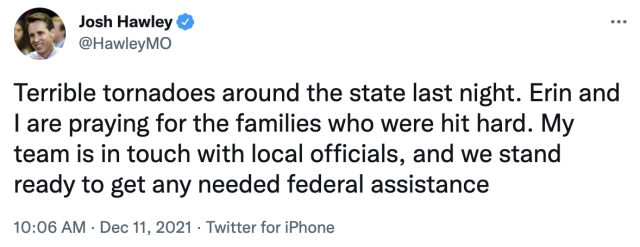 Today U.S. Senator Josh Hawley released the following statement on tornadoes and severe weather in Missouri: