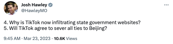 Today U.S. Senator Josh Hawley (R-Mo.), a member of the Senate Judiciary Committee and leading critic of TikTok, will be closely monitoring the House Energy and Commerce Committee hearing with TikTok’s CEO Shou Zi Chew as growing pressure mounts to ban TikTok in the United States. Ahead of this, Senator Hawley released the following questions he would like answered: