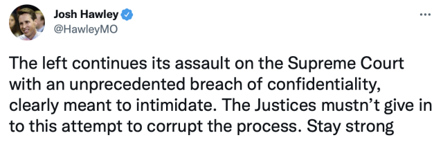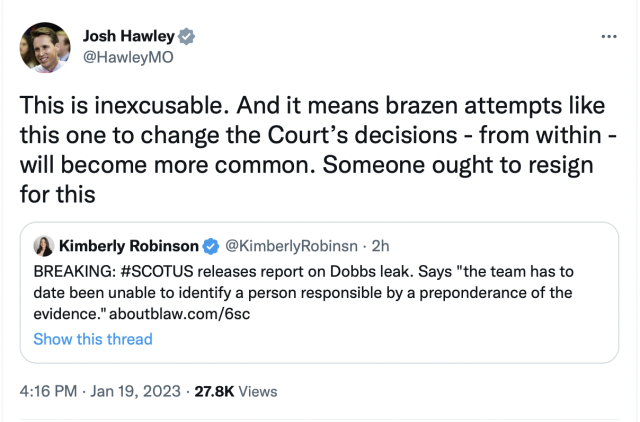 Today U.S. Senator Josh Hawley (R-Mo.) released the following statement on the announcement from the Supreme Court of the United States revealing that the investigation looking into the leak of the Dobbs v. Jackson decision has been unable to identify the individual responsible.