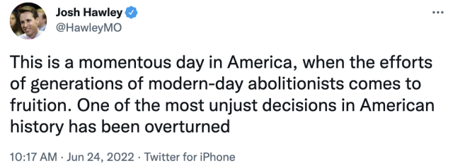 U.S. Senator Josh Hawley released the following statement after the Supreme Court's newly-released decision on Dobbs v. Women's Health Organization.