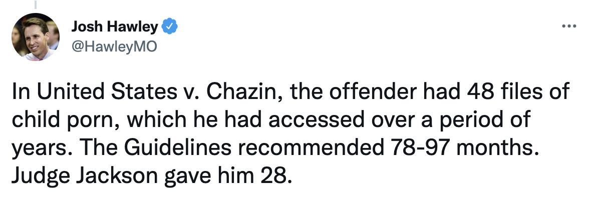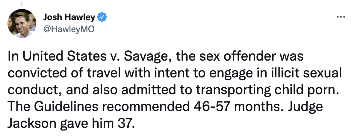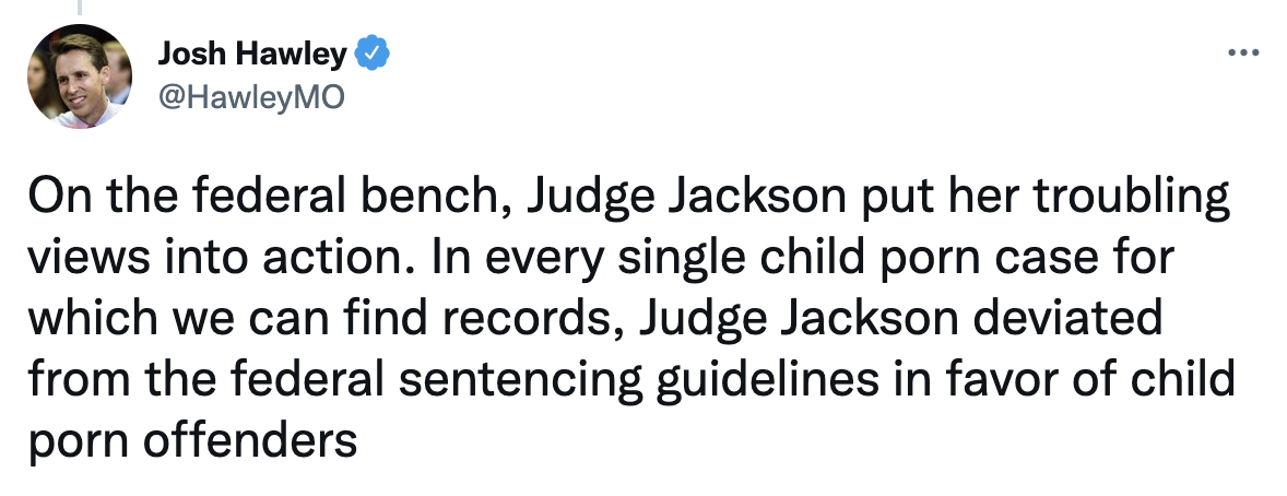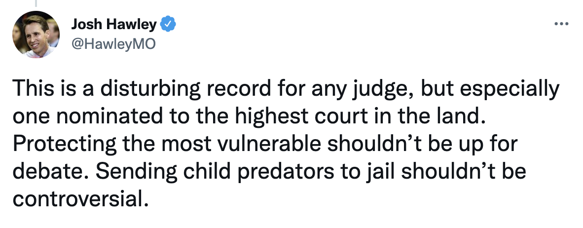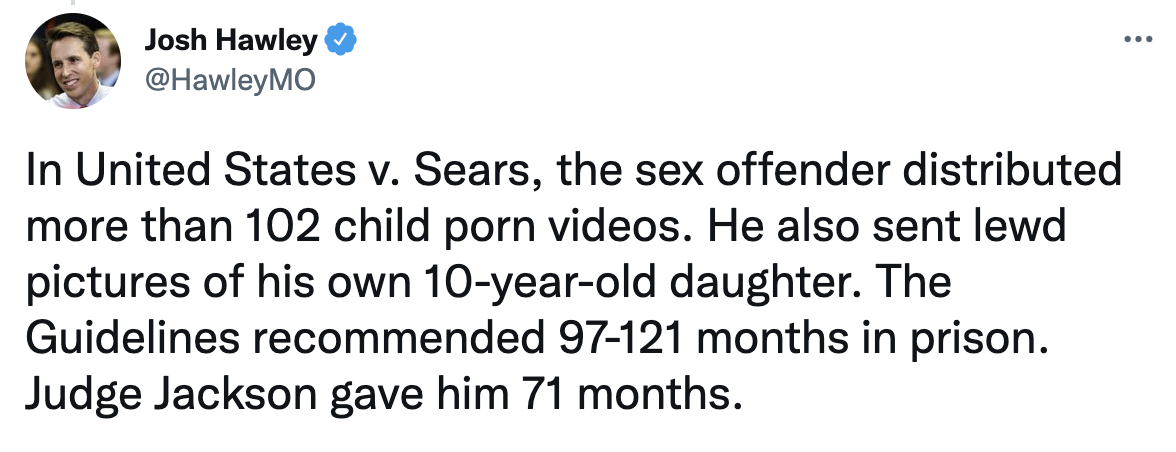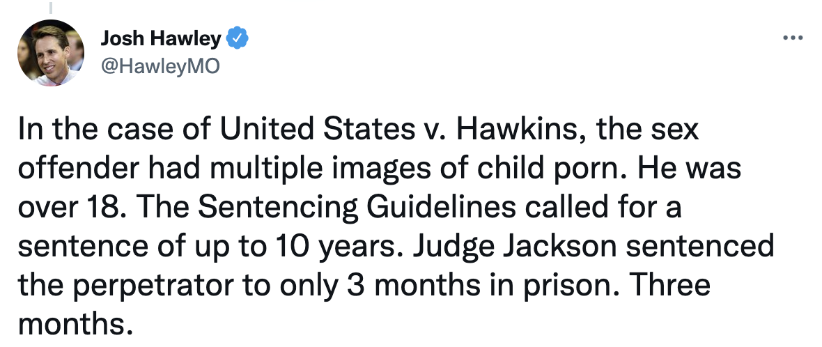 U.S. Senator Josh Hawley (R-Mo.) outlined Judge Ketanji Brown Jackson’s alarming sentencing leniency for sex criminals, especially for those preying on children.