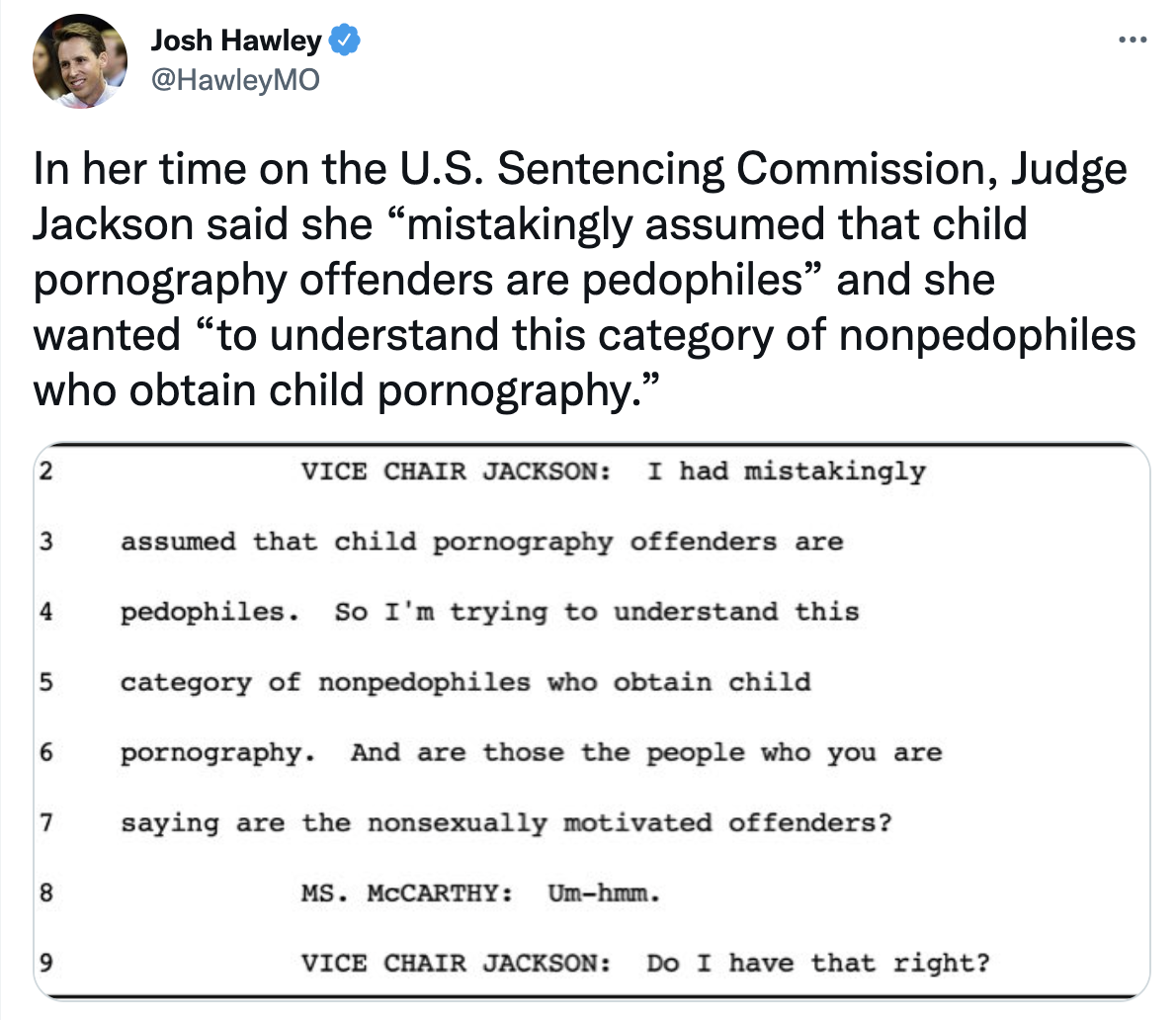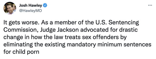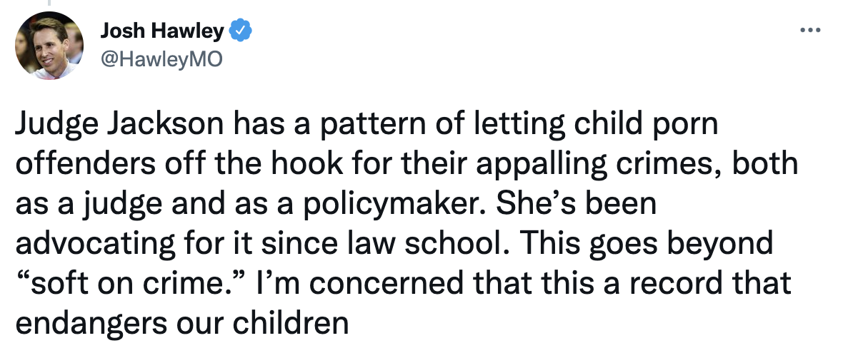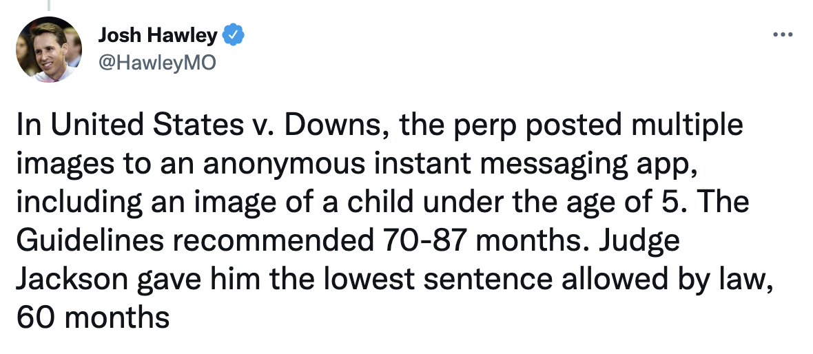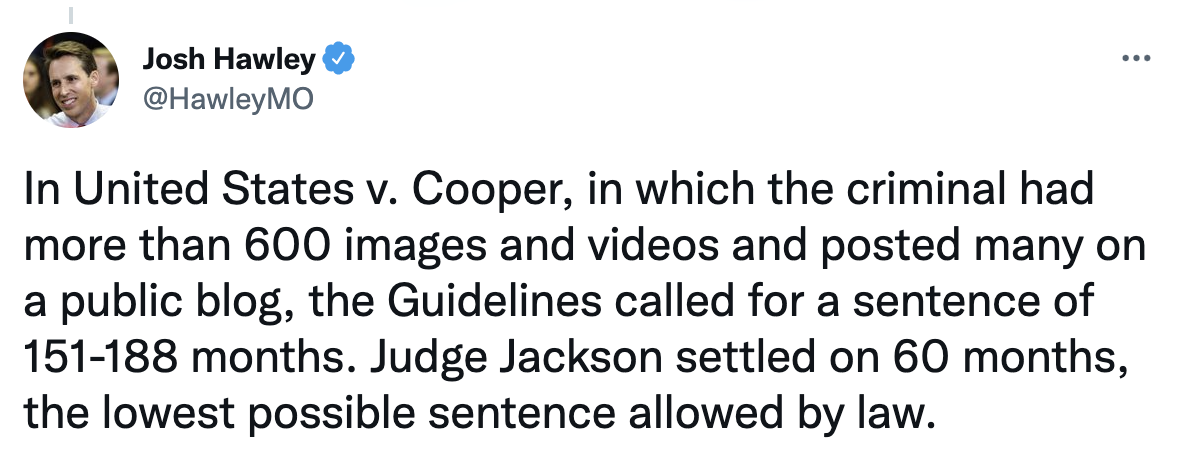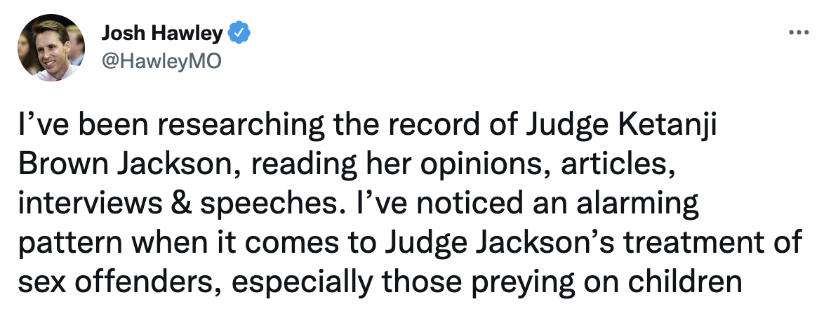 U.S. Senator Josh Hawley (R-Mo.) outlined Judge Ketanji Brown Jackson’s alarming sentencing leniency for sex criminals, especially for those preying on children.