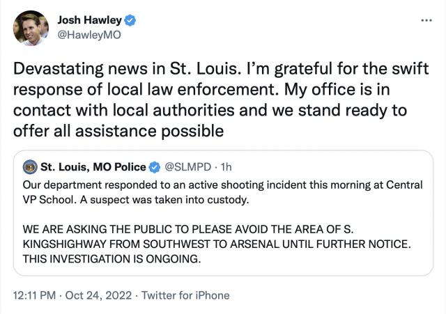 Today U.S. Senator Josh Hawley (R-Mo.) issued the following statement on the shooting at Central Visual & Performing Arts High School in St. Louis, Mo.